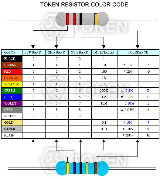 世界知名元器件制造商 TOKEN (德鍵被動元器件) 固定電阻器的色碼色環標示識別,主要應用於圓柱型的電阻器上,如:碳膜電阻、氧化膜電阻、精密電阻、耐沖擊電阻、 保險絲電阻、實芯電阻、實芯電阻、保險絲電阻、繞線電阻、突波電阻。在早期,一般當電阻的表面不足以用數字表示法時,就會用色碼色環標示法來表示電阻的阻值, 公差,規格。現在,色碼色環標示法已應用於TOKEN 的自動化生產設備上。TOKEN 生產的電阻器上的色碼色環,非常易於識別,前後端易於區分。TOKEN 的色碼色環,主 要分成兩部分: 第一部分:靠近電阻前端的一組是用來表示阻值,兩位有效數的電阻值,用前三個色環來代表其阻值,如:39Ω,39KΩ,39MΩ。三位有效數的電阻值,用前四個色環來 代表其阻值,如:69.8Ω,698Ω,69.8KΩ,一般用於精密電阻的表示。 第二部分:靠近電阻後端的一條色環用來代表公差精度。 第一部分的每一條色環都是等距,自成一組,易於區分第二部分的色環。帶有四個色環的其中第一、二環分別代表兩位有效數的阻值;第三環代表倍率;第四環代表誤差,帶有五個色環比四色環多了一個有效數字。 TOKEN 的第五條色環如為黑色,一般用來表示為繞線電阻器,第五條色環如為白色,一般用來表示為保險絲電阻器。如果電阻體只有中間一條黑色的色環,則代表此電阻 為零歐姆電阻。如何識別色碼得出阻值